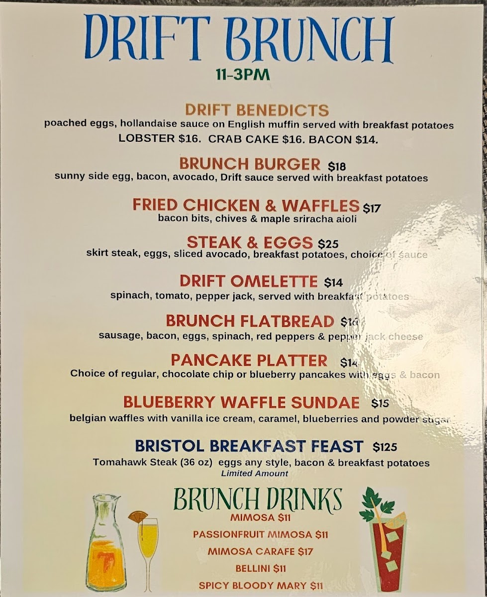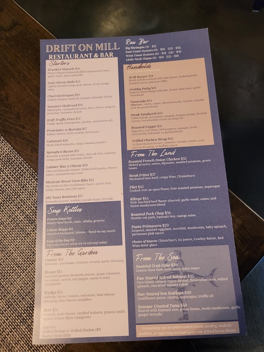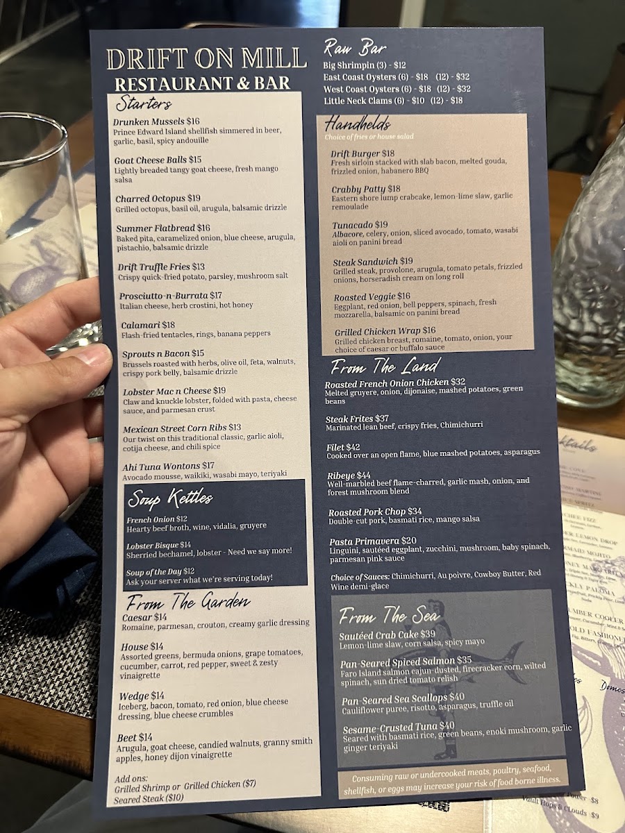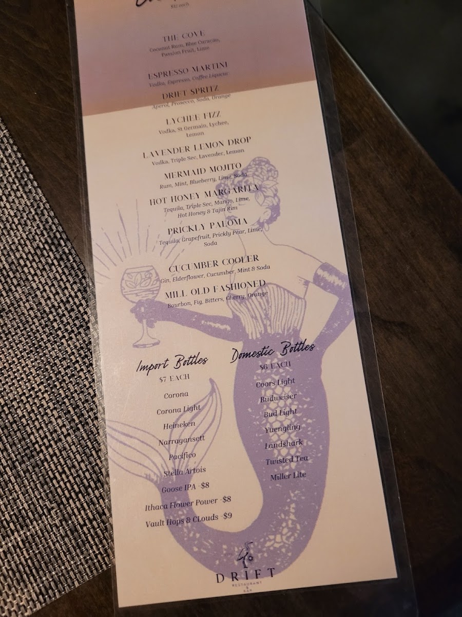 Overall, Drift On Mill offers a fantastic variety of dishes and drinks that cater to all tastes, ensuring a memorable dining experience for everyone. Whether you're here for a casual bite or a full meal, there's something for every occasion.