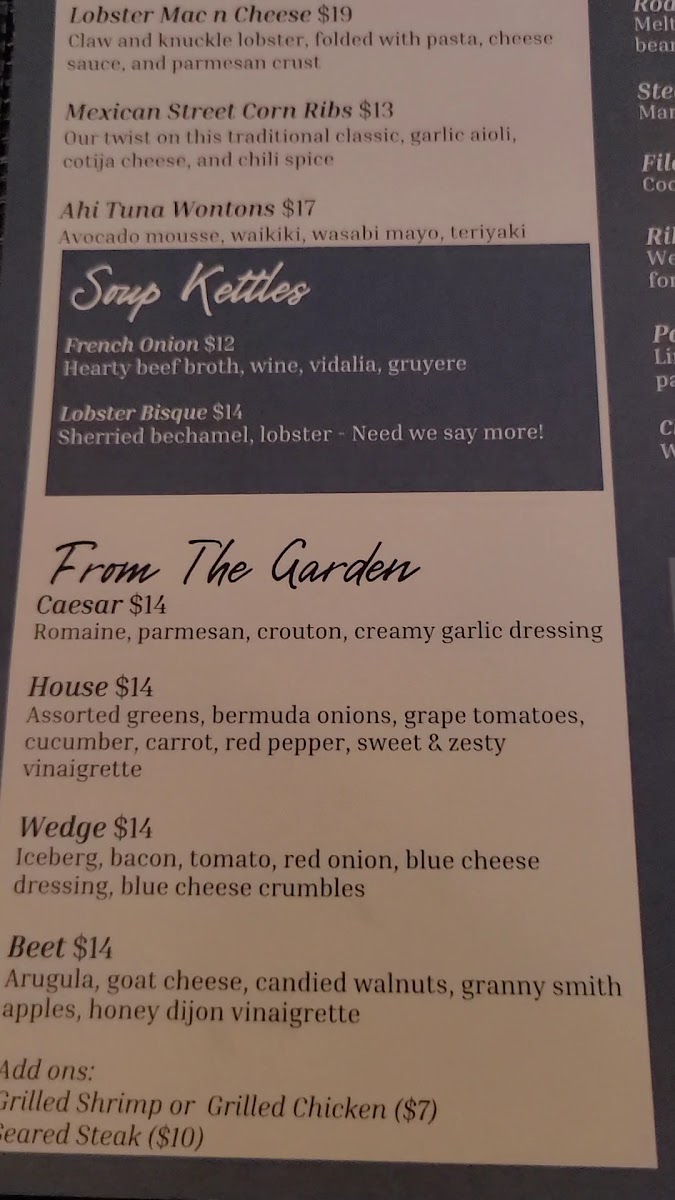 For soup lovers, the Soup Kettles section features comforting choices such as French Onion, Lobster Bisque, and the Soup of the Day, each sure to warm you up. If you prefer something lighter, the From The Garden options provide fresh and crisp salads like the classic Caesar, the hearty House, and the refreshing WedgeBeet salad.