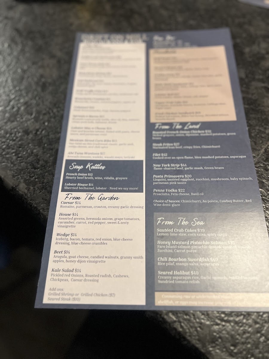 For those seeking a more substantial entrée, From The Land includes tantalizing dishes like the Roasted French Onion Chicken, the juicy Steak Frites, tender Filet, flavorful Ribeye, and the satisfying Roasted Pork Chop. On the From The Sea menu, seafood lovers can enjoy a variety of perfectly prepared options such as the Sautéed Crab Cake, Pan-Seared Spiced Salmon, Pan-Seared Sea Scallops, and the ever-popular Sesame-Crusted Tuna.